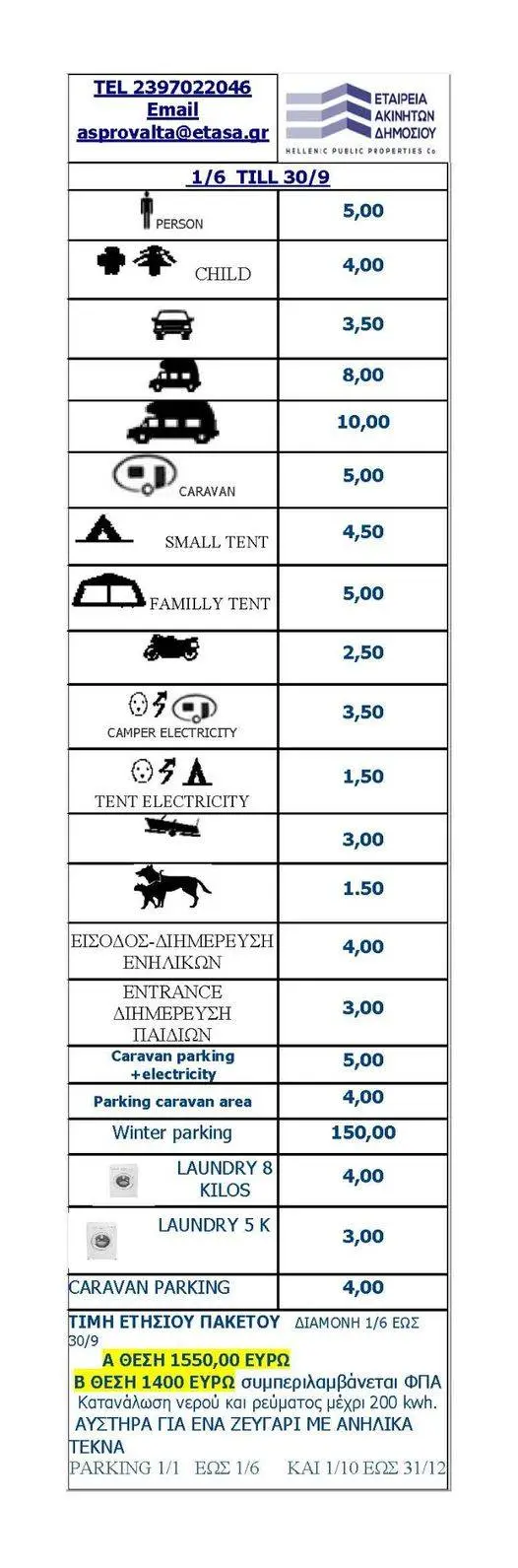 The price list for the 2025 season Camping Asprovalta